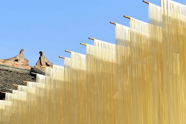 在風和日暖(氣溫不低于20℃)相對濕度60%-80%的地區或季節,將濕面條掛在掛桿上,自然風干。由于烘干時間長,因此產品質量好且不易出現酥面。我國民間多用比法。